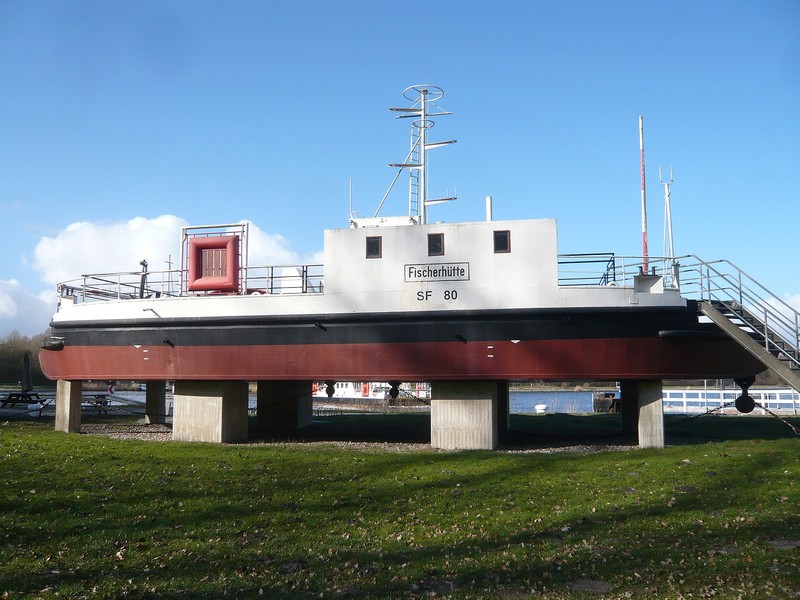 In den späten 90er-Jahren fuhr die letzte kettengebundene Fähre über den Kanal. Bei uns in Fischerhütte. Und es ist der Gemeinde mit vielen örtlichen Unterstützern (darunter auch die Vorbesitzer unseres Hauses) und der Hilfe des Wasser- und Schifffahrtsamtes gelungen, diese letzte Fähre als Denkmal bei unserer Fährstelle aufzubocken.