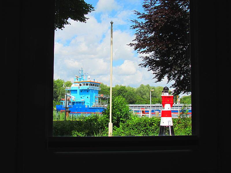 Durch das große Fenster im Wohnzimmer blicken Sie auf die Terasse und den Kanal.