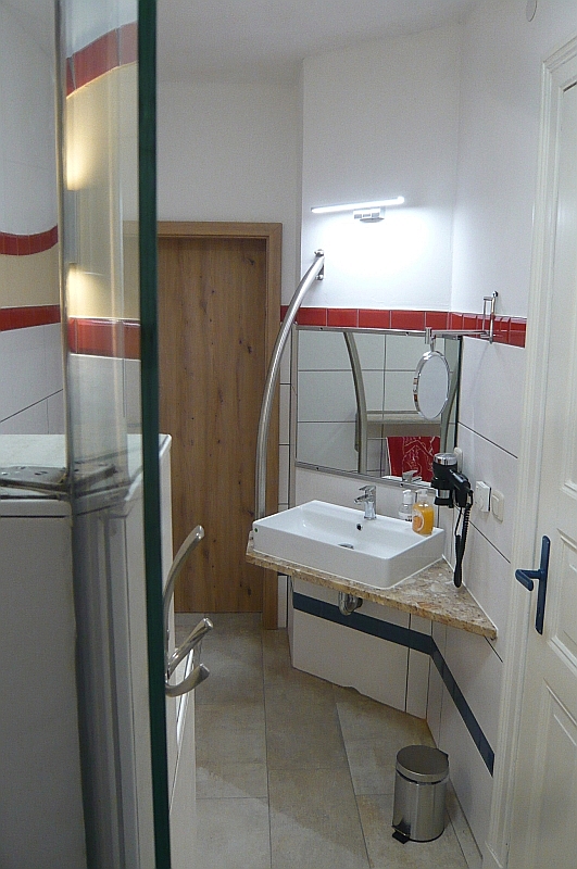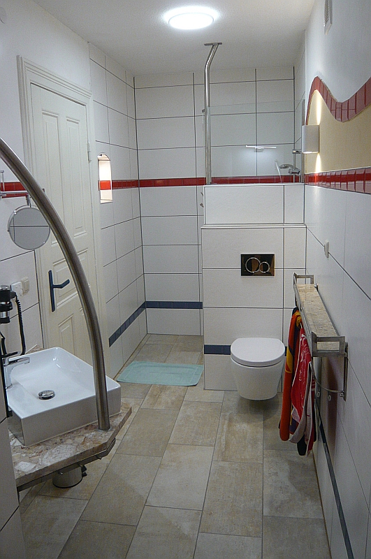 Das helle und freundliche Bad mit bodengleicher Dusche.